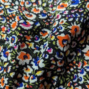 This is a wonderful Women's Boden Black Mock Neck 1/2 Sleeve Blouse with Floral Orange, Green, Yellow, Blue, & Cream Colors. Keyhole back neck with button closure in a size 12.