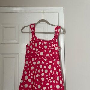 Excellent condition Boden dress, size 8 regular. Pink and White Polka dot dress, fully lined skirt. Sleeveless. Empire waist, midi length knee length. Preppy, party, casual.