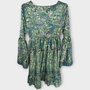 Womens Boho Dress Sz Ruffle Sleeves Bohemian Blue Green Floral Flare Sleeves V Neck