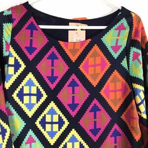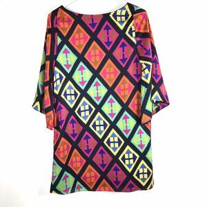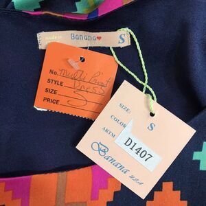 Boho Dress is new with tag...size small...100% polyester but has a satin feel...colorful geo print...bell sleeves