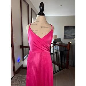 Women's Boho Hot Pink V Neck Pleated Midi Crossover Dress Tie Back SZ L NWOT