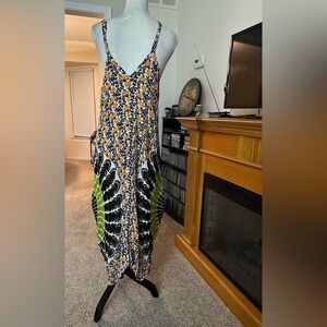 Women’s Bold Print Green Black Brown Sleeveless Maxi Dress Measures As A Large.