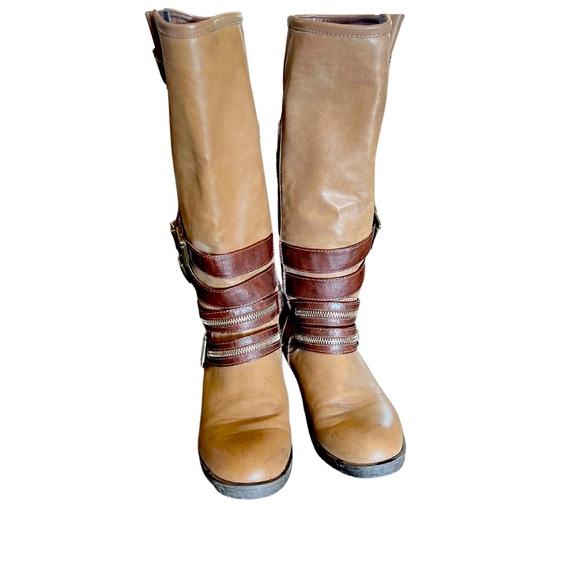 Tan boot, flat heel, brown with dark brown straps ; size 8