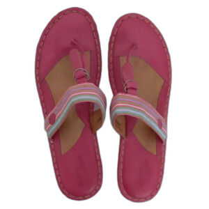 Step out in style with these chic pink sandals featuring a colorful striped strap. Perfect for any casual outing.