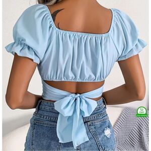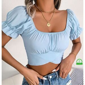 New, light blue, square neck, ruffled short puff sleeve, tagged size L, See Measurements for Custom Fit