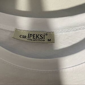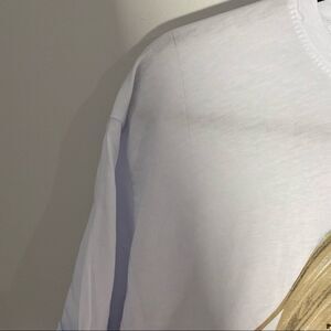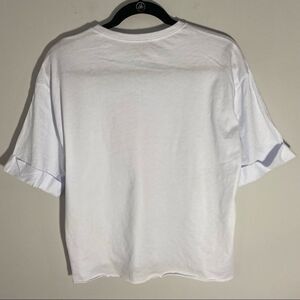 Girl printed on the front. Beads all over. Folded sleeves. White tee.