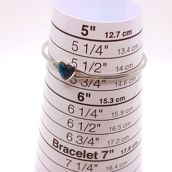 This elegant bracelet features a silver-tone metal open cuff design with a heart-shaped abalone style looking centerpiece. Its adjustable nature ensures a comfortable fit, adding sophistication to any wrist.