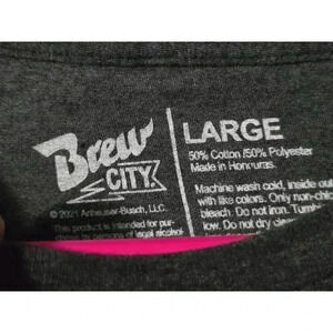 This is a pre-owned Brew City Busch Latte t-shirt in size large. It is made of 50% cotton and 50% polyester and was made in Honduras. The shirt is a dark gray color with a graphic of a blue circle with the words "Busch Latte" in white lettering on a red and black plaid background. The graphic also includes a blue mountain range. The shirt has a crew neck and short sleeves. The shirt is in good condition with no visible rips, tears, or stains. The shirt has been washed and dried and may have some minor signs of wear.