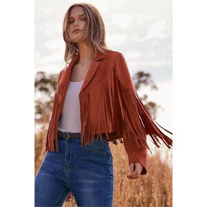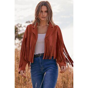Women's Brick Red Faux Suede Leather Tassel Motorcycle Cropped Jackets