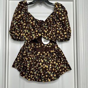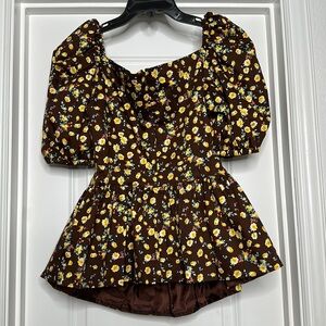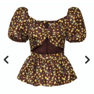 Crafted of cotton sateen, our Bridgette blouse blooms with petite wildflowers. Designed with a cinched sweetheart bodice, and puffed short sleeves, this modern take on the peplum top is finished with a cutout midriff.