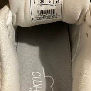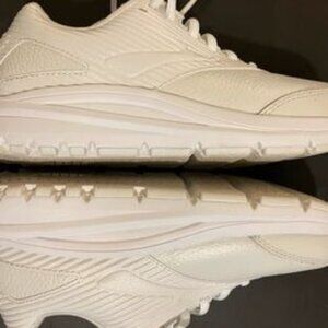 Women’s walking shoe. Comfy leather upper complements soft cushioning, great support and slip-resistant sole. Purchased new @ $130 last summer upon friend's recommendation for post-plantar fasciitis walking. Size 7 ended up being a tad too small. Only wore a few times to determine that, but it was past the return deadline. I don't have the best lighting for pictures, so the shoes look cream-colored rather than white and some shadows make areas look dark. Smoke-free and pet-free home.