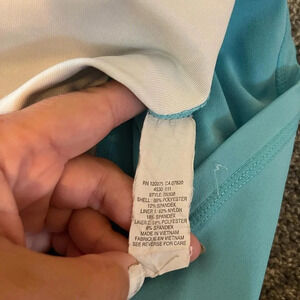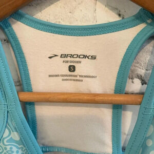 Women’s. Brooks. Turquoise and white athletic tank top. Built in bra. Racerback style. Mesh pocket on the back. Preowned condition. No stains/tears. Size small.