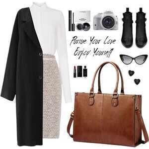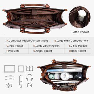 Work tote bag for women is 16.7" x 6" x 12.2"(L*W*H). Net weight: 3 lb. Distance from top handle to the bag: 8''. The adjustable shoulder strap is 23.5~47 inches long. Can be carried in several ways as an office briefcase or handbag, shoulder bag, or crossbody bag as well, which is convenient and comfortable. Suitable for most 13"/14"/15"/15.6" laptops.