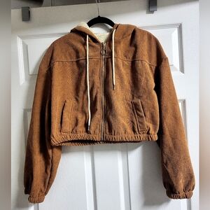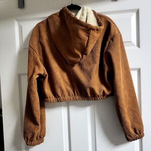 Stylish brown corduroy cropped jacket with a cozy hood. Features a zip-up front and drawstring details.