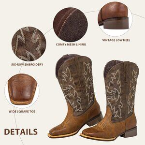Dual Color Design: These wide calf cowboy boots women feature distinctive earth tones on both sides of the boots that develop character over time. Green: Feature a unique turquoise shaft and distressed brown leather, blending modern contrast with rustic charm. Brown: Combine a retro dark brown shaft with distressed brown leather, creating a sophisticated tonal contrast. Elevating your style with understated elegance while keeping comfort intact.