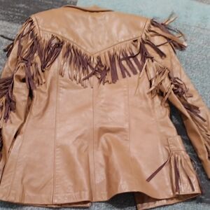 Step up your fashion game with this stylish brown leather blazer. Featuring unique fringe details, this piece adds a touch of flair to any outfit. Perfect for both casual and formal occasions. not sure of size I'm a medium it's too small so I would say small