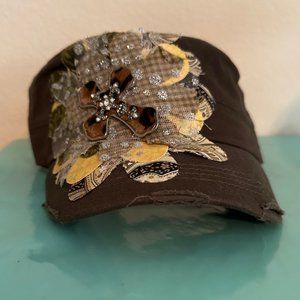 This women's faith based hat is hand-decorated. The hat is brown military style hat decorated with a silver and brown cross. The hat is adjustable and had a hole in the back for a pony tail.