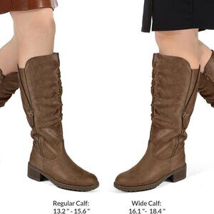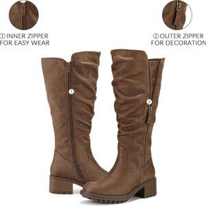 Features: These knee-high boots feature a stylish round toe, a pleated shaft, and trendy V-shaped retro zipper detail. They have two zippers — an outer decorative zipper that’s just for looks, and an inner zipper for quick, easy on-and-off. The sturdy 2-inch chunky heel and 0.8-inch platform give you a stable lift, while the cushioned insole keeps you comfortable all day long. The non-slip lug sole provides great grip on various surfaces, making these perfect for busy days or nights out.