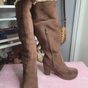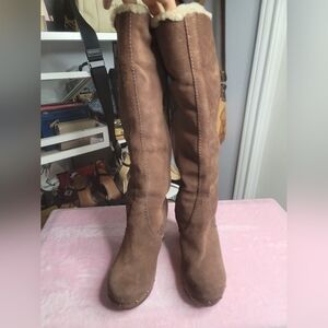 Stylish and comfortable brown knee-high boots perfect for any occasion. These boots offer a chic look with a cozy interior lining. has a small scuff on them can be cleaned I've worn them only a handful of times these boots are very flattering ,warm great for fall and winter suede material wooden heel as seen in photos
