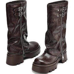 ⚡Women's Brown Leather Knee High Riding Boot Chunky Platform Low Heel Round Toe