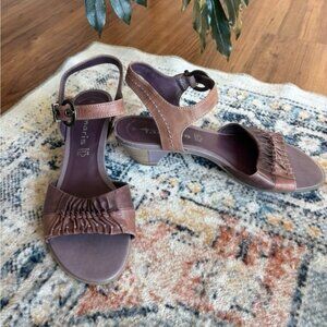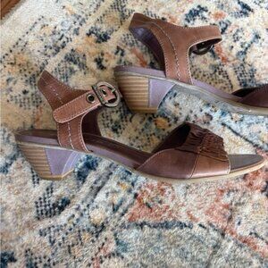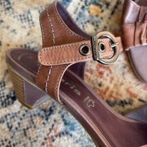 Brown leather with purple details and buckle at ankle These kitten block heels can be worn casually or dressed up while still being comfortable