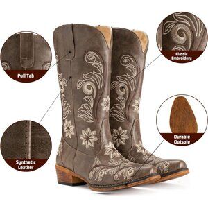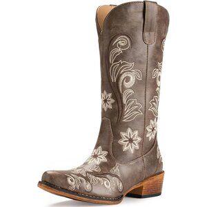 ⚡Women's Brown Mid Calf Cowgirl Boots Embroidered Pull On Tabs Snip Toe Boot