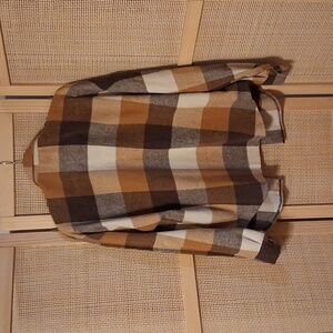 Stay stylish and warm with this Women's brown plaid jacket. Drop sleeve with a shirtail hem. Perfect for any casual outing.