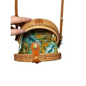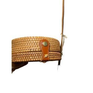 Women's Brown Round Basket Handwoven Summer Crossbody Straw Bag Leather Strap.