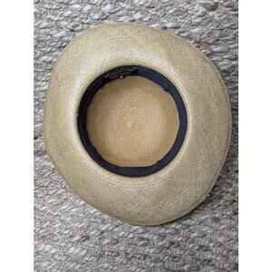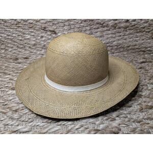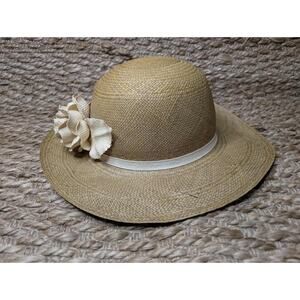 Womens Brown Straw Wide Brim Panama Hat w/ Ribbon & Flower Accent BOHO Size M