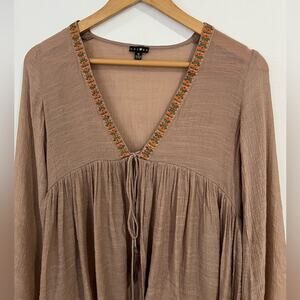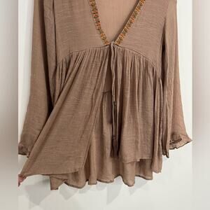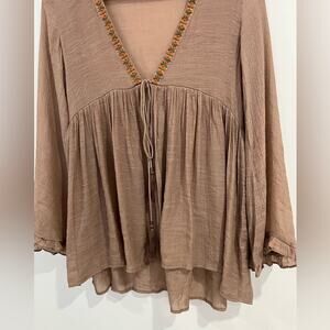 Elegant brown V-neck top with decorative trim. Perfect for casual or dressy occasions.
