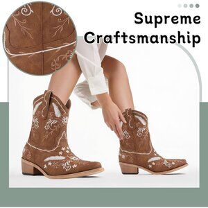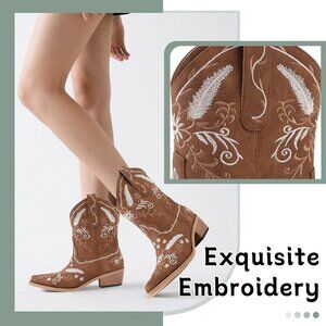 ⚡Women's Brown Western Cowboy Boots Intricate White Embroidery Mid Heel Boots