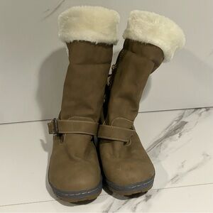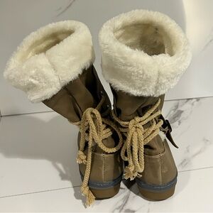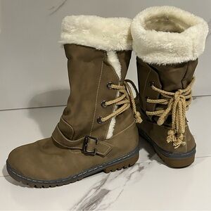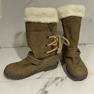 Stay warm and stylish with these women's brown winter boots featuring a cozy cream fur lining. Perfect for cold weather, these boots offer both comfort and fashion.