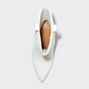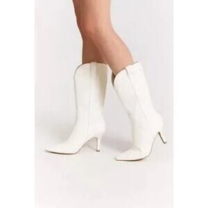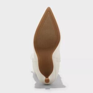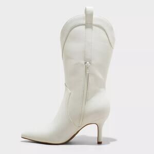 White Western cowboy boots •3in stiletto heel and 15in shaft height •Faux-leather upper •Memory foam insole and polyester lining •Pointed closed toe •Side zipper •Textured outsole Description Bryce Western cowboy boots from Wild Fable made with white faux leather.