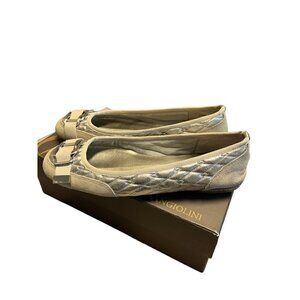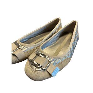A skimmer topline and curvy almond toe freshen the look of a wardrobe-staple flat designed with a low heel and wear-it-with-everything versatility.