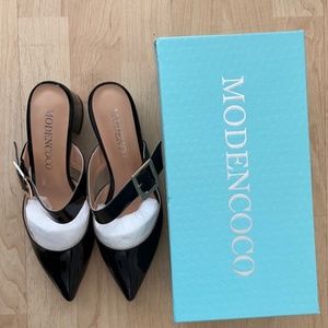Purchased on Amazon [https://www.amazon.com/MODENCOCO-Womens-Adjustable-Leather-Evening/dp/B09WHZX2CQ/ref=sr_1_3?crid=2C2AF97LIC9C3&keywords=MODENCOCO+Women%27s+Adjustable+Strap+Buckle+Patent+Solid+Pointed+Toe+Chunky+Low+Heel+Mules+Evening+Dress+Pumps+Shoes+2+Inch&qid=1676584841&sprefix=%2Caps%2C132&sr=8-3] with description: