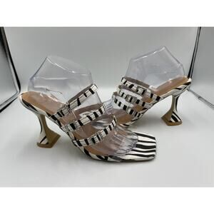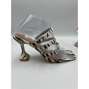 These are women's high heel pumps in a zebra print design with a transparent upper material and square toe shape. They feature a slip-on style with a buckle closure and are embellished with rhinestones. The heel height is ultra-high (4 inches and higher), making them a glamorous choice for various occasions. The shoes are US size 9, which corresponds to size 41 in the listing.