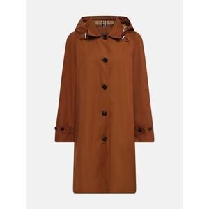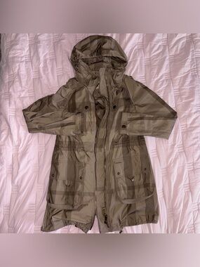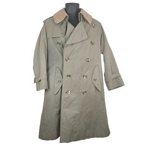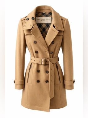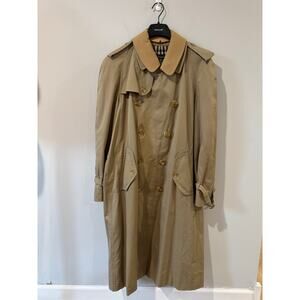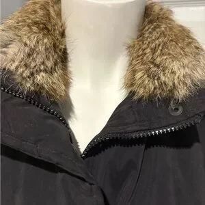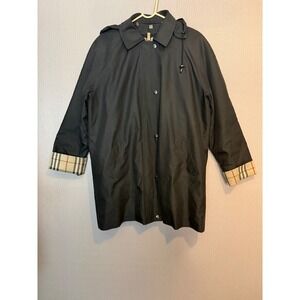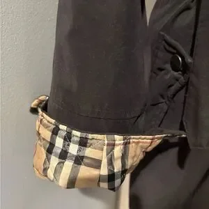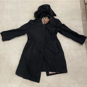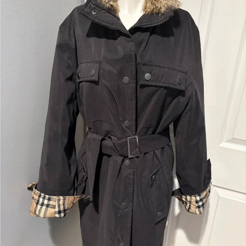 Elegant black trench coat with fur trim. Features classic Burberry check lining. Stylish and versatile.