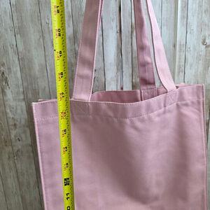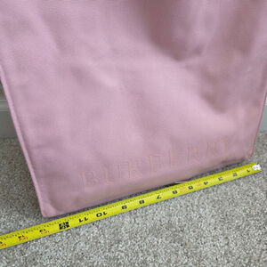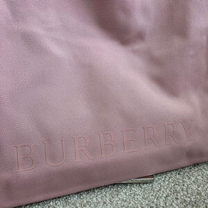 This is a Burberry tote bag, new without tags or box. The bag is light pink and made of a fabric polyester material.. The word "BURBERRY" is embossed on the front of the bag. There are no visible imperfections.