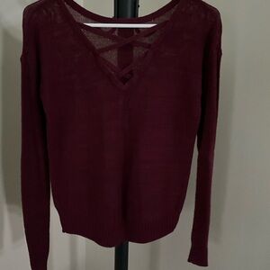 Stay cozy and stylish with this elegant burgundy crew neck sweater. Perfect for any occasion, this sweater offers both comfort and fashion. Open back with cross weave.