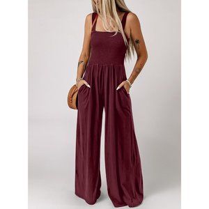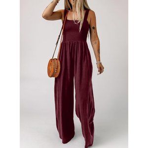 Women's Burgundy One Piece Sleeveless Wide Leg Long Pant Rompers With Pockets