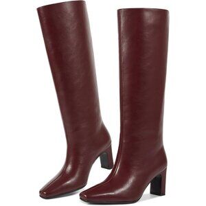 ⚡Women's Burgundy Regular Calf Friendly Square Toe Faux Leather Mid Heel
