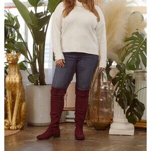Women's Burgundy Rounded Toe Stretchy Over The Knee Low Heel Wide Calf Boots