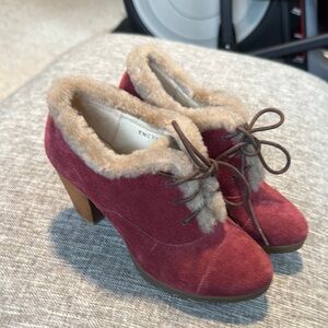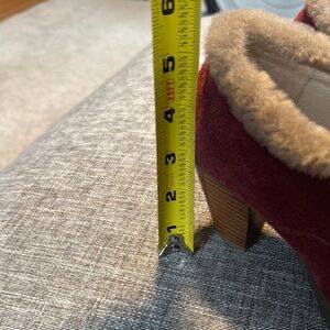 Step out in style with these chic burgundy suede ankle boots. Perfect for any occasion, they feature a cozy faux fur lining and a sturdy heel for added comfort. Elevate your wardrobe with these versatile and fashionable boots.