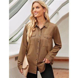 Women's Button Down Denim Shirt Collared Casual Long Sleeve Pocket Top, Brown
