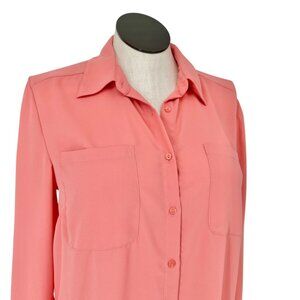 A versatile long-sleeve coral button-down shirt that combines style with comfort. Features dual chest pockets, ideal for both casual and professional settings. Features a light spring sherbet orange color.