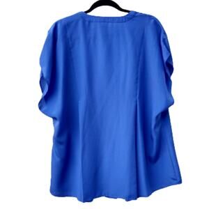 Silky blue sleeveless button-up blouse with henley neck and pleats on the front. Size tag is missing; measurements below suggest size 26/28. Note; the color may vary from device to device; the blouse is more of a periwinkle blue than a cobalt blue.