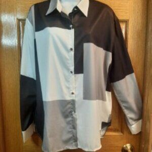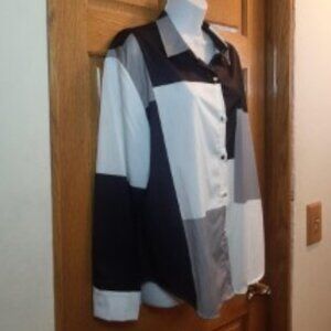 Silky Polyester Button-down Blouse. Has shiny silver buttons including on the cuffs of the shirt. Black, White and Gray squares. The shirt is new and has never been worn. There are no tags except the size. Pit to Pit measurement is 23 inches and shoulder to bottom hem is 28 inches.