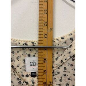 This is a women's CAbi blouse with a sleeveless design, featuring a floral pattern, V-neckline, tie front closure, and flutter sleeves with ruffle accents. It is made of lightweight polyester and rayon material, in a size small. The style is basic with a bohemian and classic theme, perfect for a stylish and comfortable look.