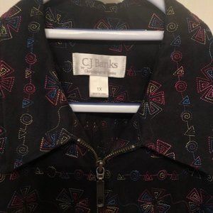 CJ Banks Black and colorful design zippered jacket. Body 100% cotton, decoration 83% Rayon, 17% Polyester. Size 1x. In excellent condition, no rips, tears or stains.