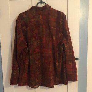 This is a women's CJ Banks collared zippered jacket. It is in a size 1X and it is maroon in color. It also has some designs of flowers on it. This jacket is in excellent condition with no rips, tears or stains.
